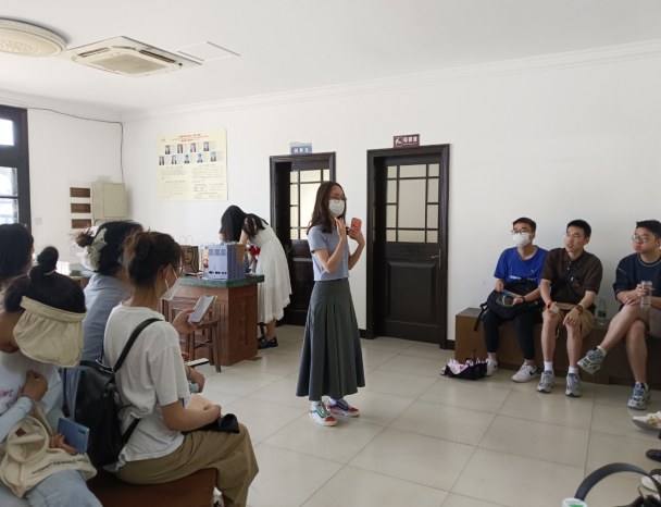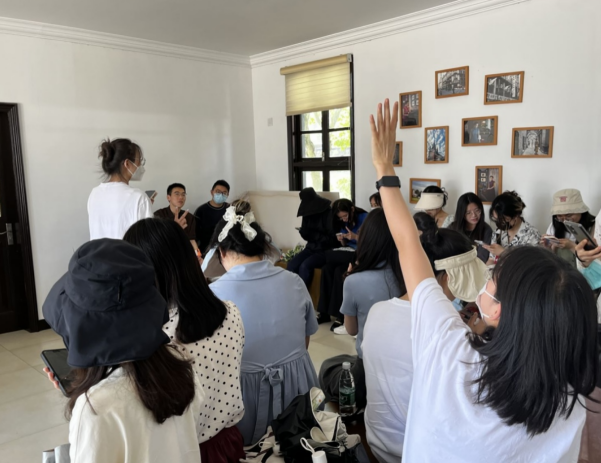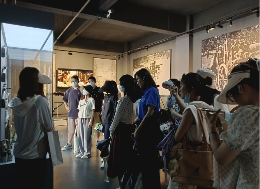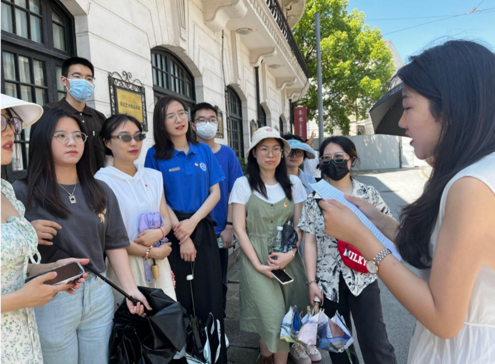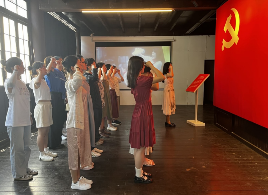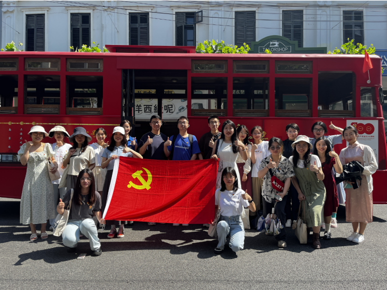 在静安寺路站,同学们参观了红色主题电影道具展览,重温了1927年八七会议后,党带领人民在武装斗争中各个战线的光影故事。在新青年编辑部,组织委员林文敏同学向大家讲述了《共产党宣言》诞生的故事及其在党史中的重大意义。围坐在一大会议长餐桌前,同学们沉浸在电影《开天辟地》一大会议召开时的音乐中,穿越时空参与1921年的历史会议,感受一大会议的庄严肃穆和党的伟大历史时刻。入党积极分子王雨婷同学用英文对伟大建党精神进行了阐述,认为“历史车轮滚滚向前,党的精神世代相传。唯有不忘初心,忠于党和人民,才能最终到达民族复兴的彼岸”。在一大纪念红船上,伴随着国际歌雄壮的旋律,大家观看一大会议召开的历史影像,实景沉浸式体会开天辟地、敢为人先的红船精神。在南京路帐子公司,同学们沉浸参演“五卅惨案”发生的场景,缅怀为民族独立、国家富强付出生命的革命志士。支部书记任牧琪同学用英语讲述南京路的前世今生,回忆上海解放两个第一“sheng” (上海解放第一“声”、南京路红旗第一“升”)。最后,在中共二大会址,同学们面向鲜红的党旗,高举右拳,重温入党誓词,在铿锵的誓言中,同学们的初心受到洗礼,理想信念更加坚定。